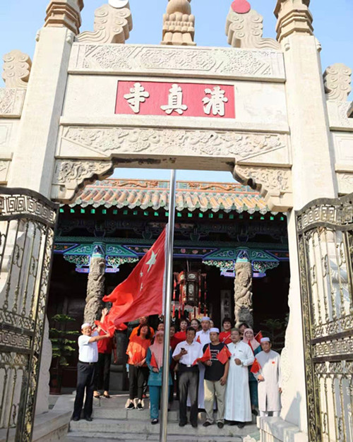 在祖国成立70周年可喜可贺的美好节日里。10月1日早上,济宁市越河同心慈善义工团组织队员,身穿着靓丽的绿马夹来到济宁市顺河东大寺开展升国旗、唱国歌活动,以满腔热血和爱国热忱庆祝中华人民共和国成立70周年。