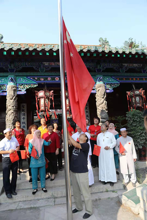 队员们身穿着民族特色的绿马夹,手拿着鲜艳的五星红旗,精神抖擞的高唱我和我的祖国、没有共产党就没有新中国等爱国歌曲,以美好的真诚祝愿,祝福我们伟大的祖国繁荣富强、国泰民安。随着雄壮而庄严的国歌声,清真寺里鲜红的国旗升上了空中。
